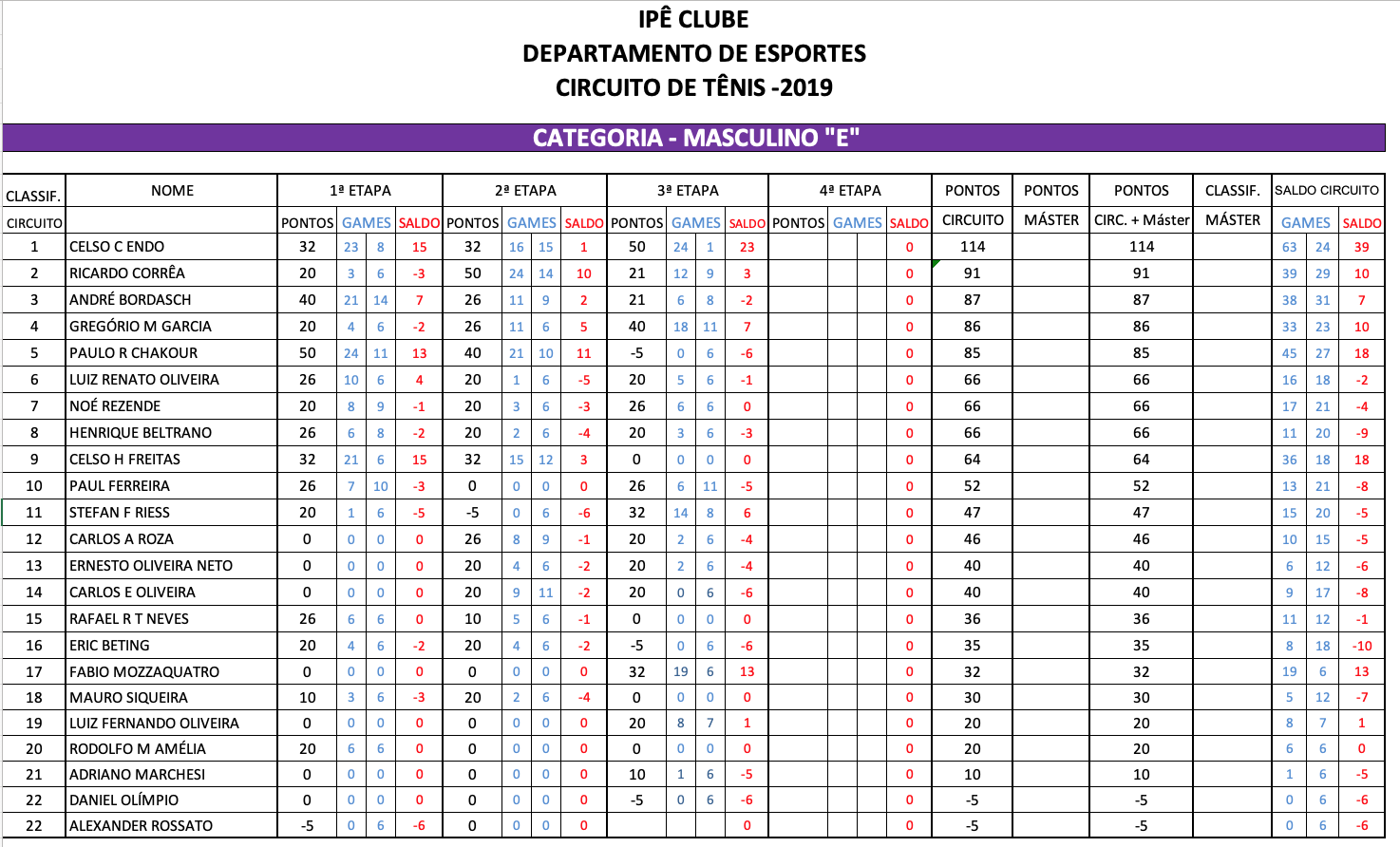 A 4ª etapa do Circuito Interno de Tênis 2019 iniciará com tudo para a categoria adulto masculino – E, no dia 11 de novembro.
